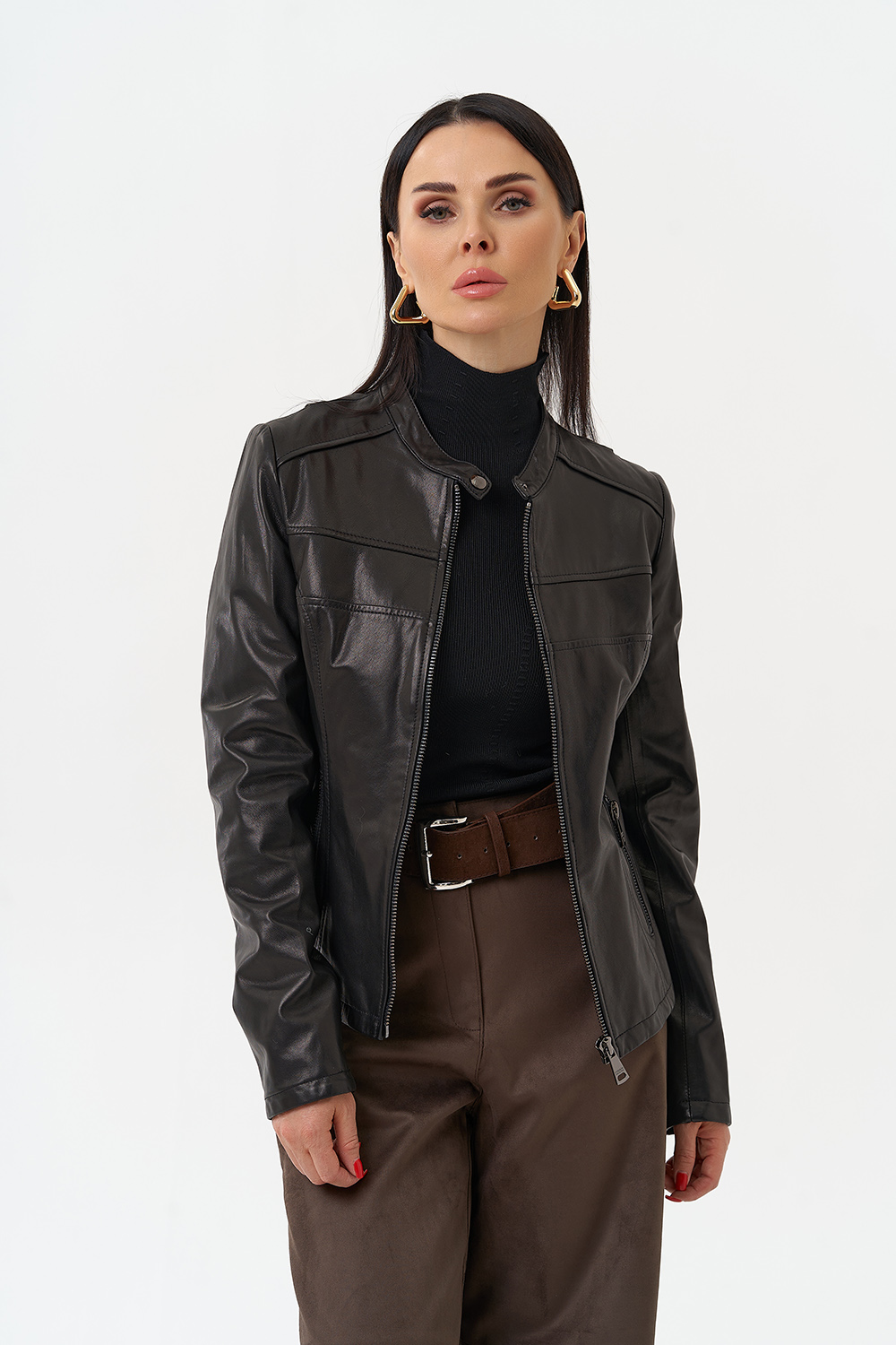Элегантная женская куртка из натуральной кожи в черном цвете с бронзовым блеском. Классический полуприлегающий фасон подойдет для сдержанных и элегантных образов. Данный оттенок сочетается со всеми цветами, что делает данную куртку базовой в вашем гардеробе. Фигурные вытачки данной модели визуально стройнят. Изделие дополнено аккуратным воротом-стойкой и молнией. Представлен большой размерный ряд от 42 до 52 размера.