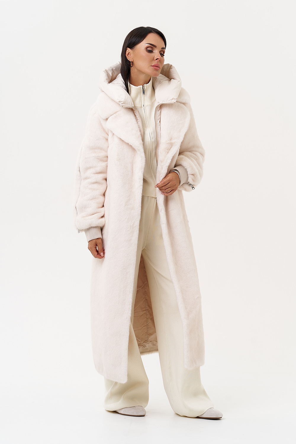 Фасон - прямой Длина изделия - 120 см Цвет - светло-бежевый (молочный) Материал - экомех Состав полотна - полиэстер 100% Подкладка - полиэстер 100% Вид застежки - крючки, пояс Вид ворота - съёмный капюшон, английский воротник Фасон рукава - реглан, длинный |